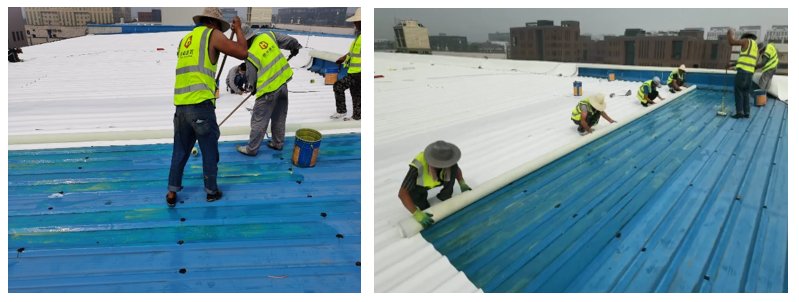 Выбор решения для восстановления гидроизоляции. Проект Пекинского пищевого завода «Манктон» требовал лишь восстановления гидроизоляционных свойств. Поэтому была применена система полного приклеивания, обеспечивающая прочное соединение рулонов ПВХ с поверхностью стальной пластины с помощью специального атмосферостойкого клея. В местах нахлеста использовалась сварка горячим воздухом, что обеспечило прочное, надежное и бесшовное соединение. Конкретное применение решения для восстановления гидроизоляции кровли с использованием рулонов ПВХ в этом проекте показано на рисунке 2.