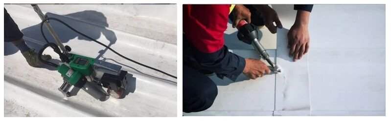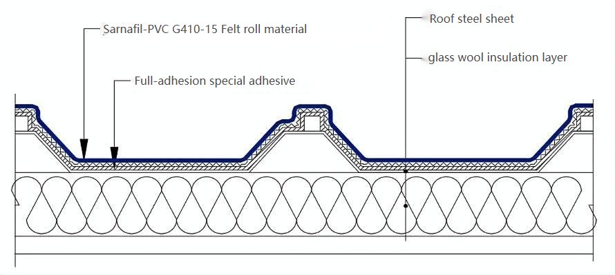 Преимущества использования системы кровельной мембраны из ПВХ с полным прилеганием для ремонта включают: 1) Тонкая и мягкая водонепроницаемая мембрана из ПВХ легко приклеивается к гофрированным поверхностям профилированного стального листа.