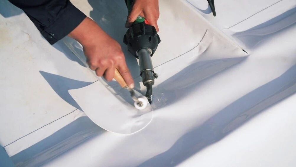Последовательность работ: Очистка основания → Укладка и надежное закрепление водонепроницаемой ПВХ-мембраны → Сварка мембраны горячим воздухом → Детальная обработка.
