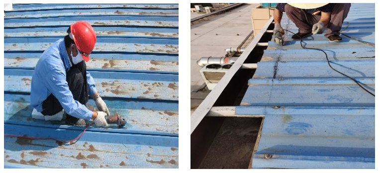 Рисунок 3. Шлифовка и удаление ржавчины с основания из стальной пластины (слева) и удаление излишков стальной пластины в области водостока (справа).