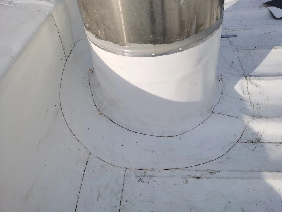 На примере проекта по устройству кровли из профилированного стального композита на заводе «Мантон» в Пекине, осмотр на месте показал, что стальной лист подвержен деформации из-за температурных и нагрузочных деформаций базового слоя стальной конструкции. Под воздействием теплового расширения и сжатия, ветровых нагрузок и пешеходного движения стыки стального листа ослабевали и расходились, повреждая первоначальную гидроизоляцию и вызывая протечки. В частности, в местах соединения, где использовались различные материалы — например, соединение парапетной стены и водостока из стального листа, а также световые люки и другие выступающие части крыши — асинхронные изменения напряжений в материалах приводили к ослаблению стыков, вызывая прямое проникновение дождевой воды в здание (рис. 1).