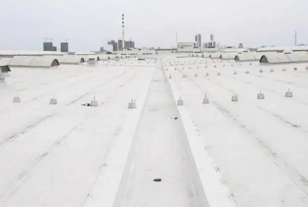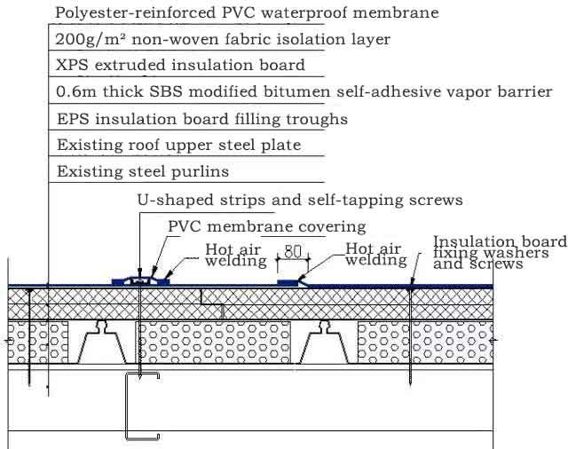 En primer lugar, rellene los canales del panel de techo de metal existente, luego coloque una capa de 0,6 mm de espesor de membrana SBS autoadhesiva Soprema; luego instale la membrana de PVC reforzada con fibra de poliéster sobre la capa de aislamiento utilizando métodos de fijación mecánica.