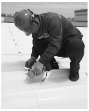 3) Все продольные нахлесты самоклеящейся бутиловой ТПО-мембраны свариваются с помощью аппарата для сварки горячим воздухом. Ширина нахлеста двух мембранных листов составляет 80 мм (рис. 6). Перед сваркой необходимо провести пробную сварку для регулировки температуры и скорости сварки. После пробной сварки мембрану разрезают на небольшие кусочки для проверки на отслаивание. Если между слоями мембраны происходит когезионное разрушение, можно начинать обычную сварку. Перед сваркой сварочный шов должен быть чистым и свободным от загрязнений. Если шов долгое время оставался открытым без сварки, его следует очистить чистой тканью и специальным чистящим растворителем (ксилол, винилацетат). Сварку горячим воздухом следует проводить только после полного испарения растворителя.