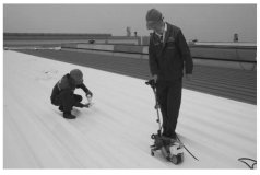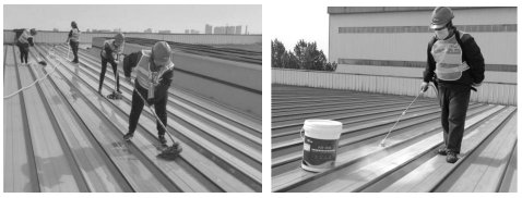 Крыша была очищена от мусора, а основание промыто водой. Затем с помощью швабры были удалены пыль и пятна от воды с поверхности металлических кровельных панелей, чтобы убедиться в чистоте основания и отсутствии загрязнений (рис. 1). После очистки и высыхания основания была нанесена специальная грунтовка. Специальная грунтовка представляет собой новый тип материала, состоящий из полимерной эмульсии и многофункциональных добавок. Она обладает хорошими герметизирующими свойствами, высокой проникающей способностью и высокой прочностью сцепления, что увеличивает адгезию между самоклеящейся мембраной и основанием, обеспечивая лучшее сцепление самоклеящейся водонепроницаемой мембраны с основанием. Специальную грунтовку можно наносить распылением, что значительно повышает эффективность строительства (рис. 2). Количество используемой грунтовки составляет приблизительно 0,2–0,4 кг/м2.