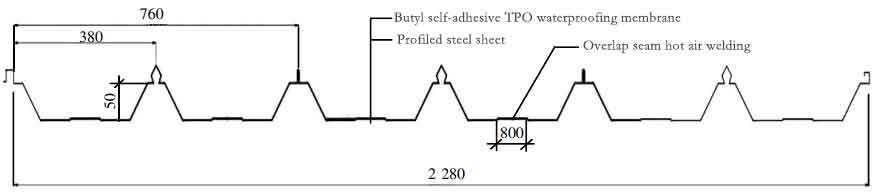 3.2 Монтаж гидроизоляционной мембраны 1) Укладка мембраны: Исходя из профиля гофрированного стального листа (YX51-380-760) на объекте, определите положение укладки первого листа мембраны (Рисунок 3). Поскольку самоклеящаяся бутиловая гидроизоляционная мембрана TPO имеет ширину 1000 мм, расчеты показывают, что после укладки первого листа мембраны вдоль желоба и гребня первого гофрированного стального листа, положение длинного края перекрытия второго листа мембраны с первым листом также будет располагаться на плоской поверхности желоба второго стального листа. Следуя этому методу, можно обеспечить расположение длинного края перекрытия всех листов мембраны в желобе стальных листов, что повышает коэффициент использования автоматического аппарата для сварки горячим воздухом, сокращает объем ручной сварки и повышает эффективность строительства.