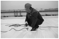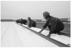 5) Перед установкой монтажных зажимов для фотоэлектрических модулей положение зажимов определяется с помощью разметочных линий. Затем на кровельную мембрану предварительно устанавливаются тонкие металлические прокладки. Прокладки изготовлены из алюминиевой фольги толщиной 0,4 мм. Предварительная установка прокладок значительно снижает износ кровельной мембраны, вызванный прямым контактом с зажимами, защищая целостность водонепроницаемого слоя. В соответствии с разметочными линиями, два винта на зажиме изначально оставляют ослабленными. После установки зажима на прокладку, с помощью электрического гаечного ключа зажим затягивают на гребне гофрированного листа (рис. 12). Зажимы были испытаны на прочность на растяжение с кровельной мембраной и стальным листом, достигнув силы растяжения 1,177 кН, что соответствует требованиям.