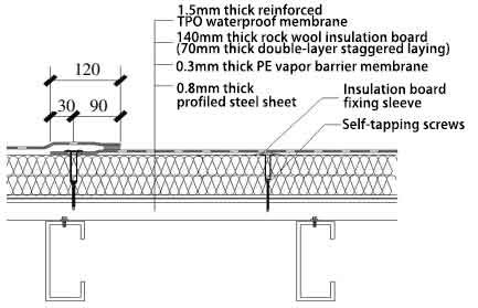 1) Основным гидроизоляционным материалом для кровельной системы является гидроизоляционная мембрана ТПО (термопластичная полиолефиновая мембрана). Этот материал обладает хорошей гибкостью при низких температурах, атмосферостойкостью, долговечностью и свариваемостью горячим воздухом, а также хорошо интегрируется с различными кровельными изоляционными конструкциями, образуя систему гидроизоляции и утепления. В данном проекте используется гидроизоляционная мембрана ТПО, армированная полиэстером, шириной 2,0 м и толщиной 1,5 мм. Стыки внахлест свариваются горячим воздухом.
