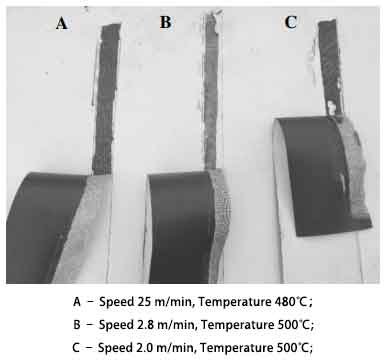 2) Перед началом сварки или после резкого перепада температур необходимо провести пробную сварку для определения оптимальной температуры и скорости сварки. Температура окружающей среды должна быть не ниже -10°C. На рисунке 3 показан разрыв сварного шва при различных температурах и скоростях сварки (13–19°C). В данном проекте пробная сварка была выполнена с использованием комбинации A, показанной на рисунке 3, то есть скорости сварки 2,5 м/мин и температуры 480°C.