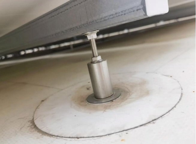 3. Какие существуют типы фотоэлектрических оснований из TPO и каковы процессы их установки? В настоящее время на рынке представлены три распространенных типа оснований из TPO: тип с креплением на саморезах, тип с заклепками и анкерный тип. Тип с креплением на саморезах, как следует из названия, крепится к профилированному стальному листу с помощью саморезов, проникающих через изоляционный слой; тип с заклепками, насколько я понимаю, аналогичен распорным болтам; анкерный тип использует поворотный анкерный элемент, который сначала вставляется вертикально, а затем поворачивается на 90 градусов для фиксации. Этапы установки: позиционирование основания, сверление мембраны, вырезание отверстия в изоляционной минеральной вате, удаление минеральной ваты, очистка от остатков минеральной ваты, сверление отверстий в профилированном стальном листе электродрелью, очистка мембраны вокруг основания, установка основания и термическая сварка основания с кровельной мембраной горячим воздухом.