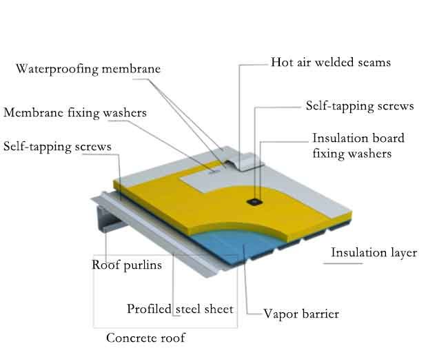 Гибкая кровельная система на основе ТПО-материалов обычно монтируется на гофрированную стальную или бетонную кровельную конструкцию. Для решения проблем гидроизоляции и долговечности поверх несущей конструкции добавляется слой теплоизоляции и долговечный слой из ТПО/ПВХ-материала. Проще говоря, это водонепроницаемая мембрана, укладываемая на поверхность крыши.